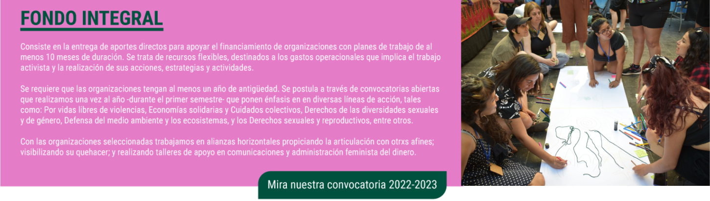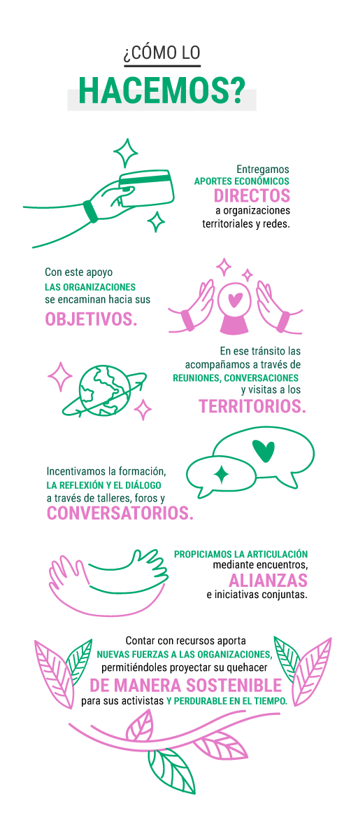 ENTREGAMOS RECURSOS ECONÓMICOS, acompañamiento y talleres a organizaciones territoriales y redes de mujeres, niñas y personas trans que trabajan por el avance de sus derechos. Con estos recursos les apoyamos en el cumplimiento de sus objetivos.
